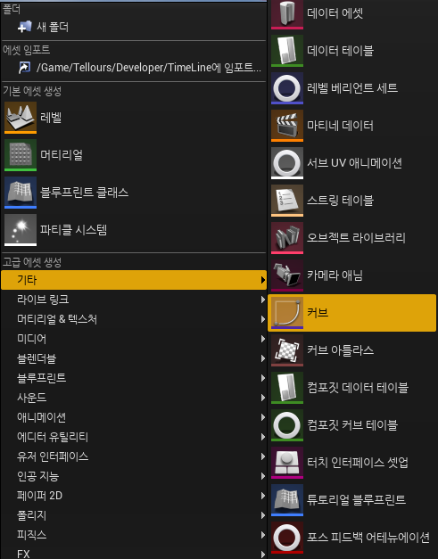 먼저, 언리얼 에디터에서 기타 → 커브로 해서 커브를 제작한다.