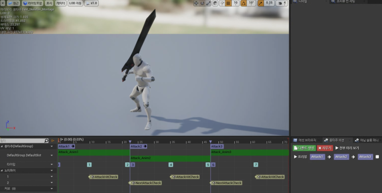 Attack1 ~ Attack3까지 연속적으로 애니메이션이 재생되게 하고, 각 섹션이 시작하기 전에 NextAttackCheck를 하도록 했다.