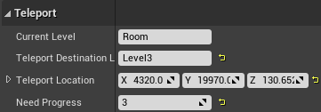하지만 Level 1을 깬 뒤 Level 2 텔레포트를 생성하게 하는 것이 아닌, 실제로는 맵에 구현이 되어 있지만 레벨을 불러올 때마다 진행도(Progress)를 확인하고 이보다 낮으면 Destroy()를 하도록 해서 진행도와 맞지 않는 레벨로 이동하는 것을 막아보고자 한다.