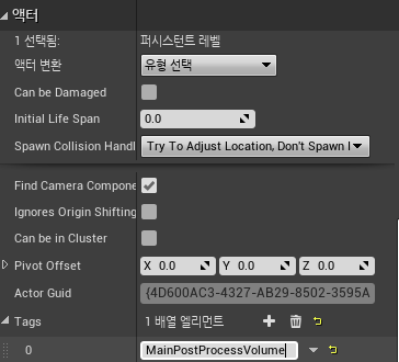 또한 코드상에서 이 볼륨을 찾기 위해 MainPostProcessVolume이라는 Tag를 설정해준다.