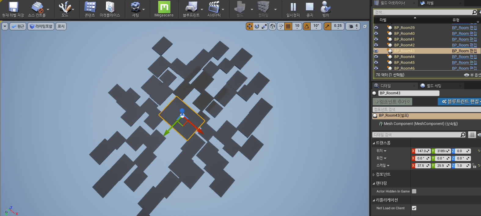 하나의 메인룸을 가운데에 두고 이동할 수 있는 위치에 똑같은 크기를 가진 복도, 방 등을 스폰시켜서 이어보면 원하는 랜덤맵과 동시에 에셋 크기에 구애받지 않고 제작할 수 있겠다 하는 자신감이 생겼다.