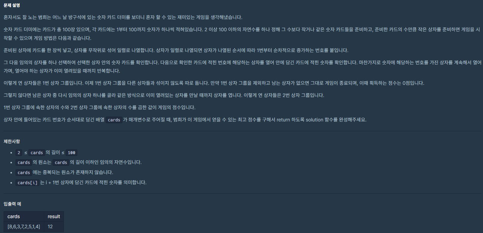 입력으로 주어진 cards에서 시작할 수 있는 모든 값을 시도해보는 방법으로 구현하였다.