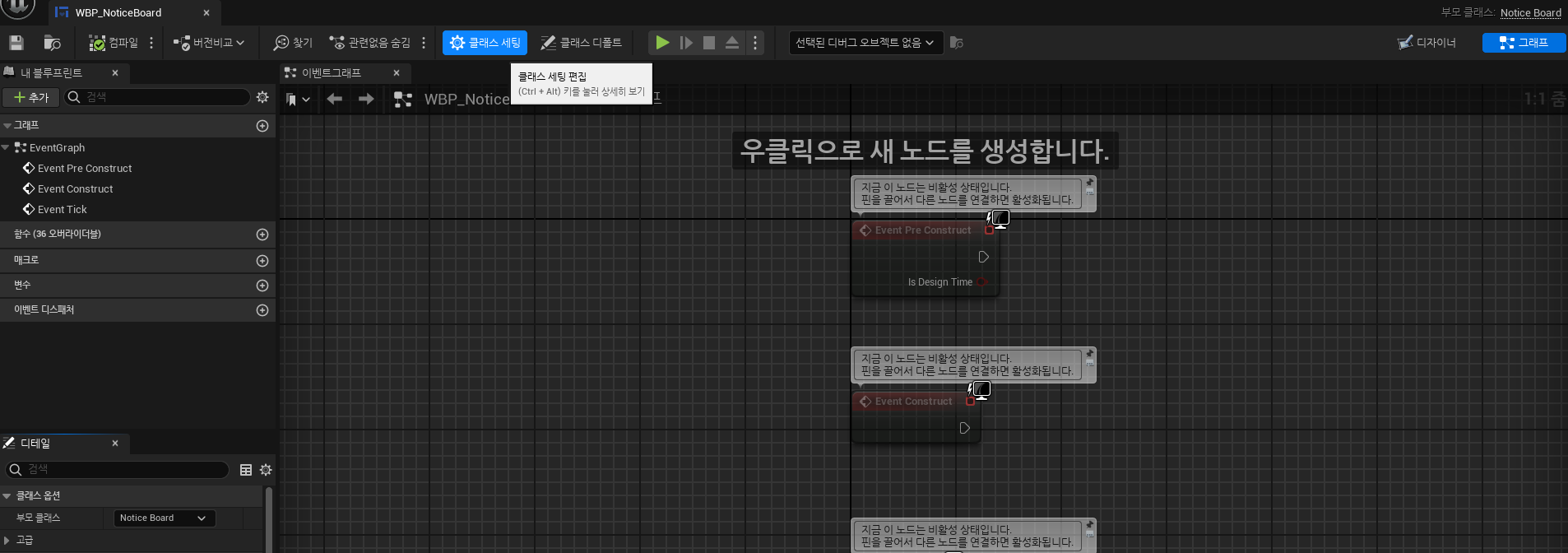 UserWidget을 상속받는 C++ 파일을 작성해주고 (필자는 NoticeBoard라는 이름으로 만들었다.) 설명했던 WBP_NoticeBoard에 부모 클래스로 설정해준다.