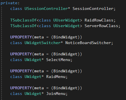 헤더파일에서 meta = (BindWidget)을 이용해서 WBP에서 설정해줬던 고유한 이름을 가진 객체들과 연결해준다.