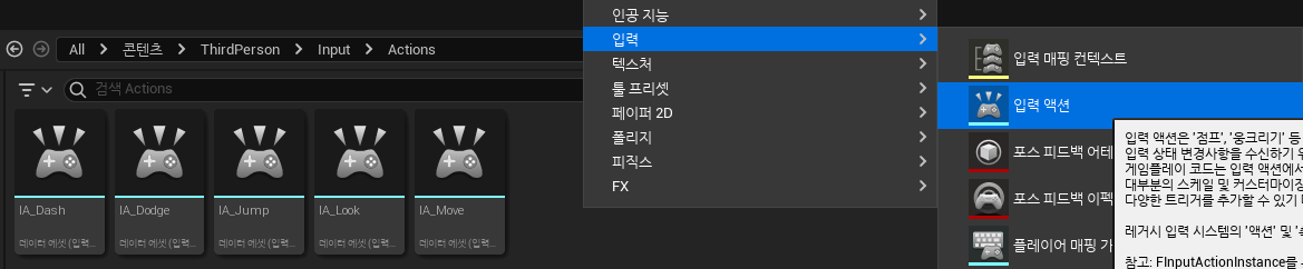 기본적으로 구현되어 있는 ThirdPerson을 사용할 것이기 때문에 Content/ThirdPerson/Input/Actions에 가서 입력 액션을 하나 만들어준다. 필자는 IA_Dodge라는 이름으로 만들었다.