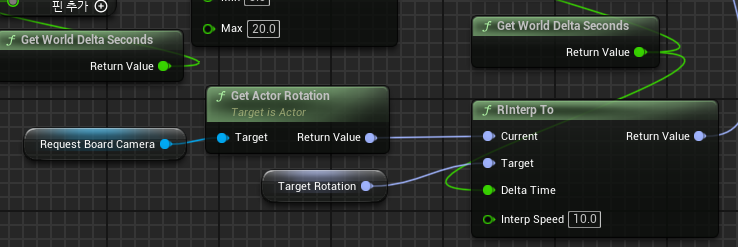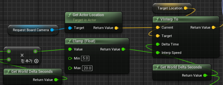 구해진 값을 속도(Interp Speed)로 지정해주고, 현재 생성되어 있는 카메라의 위치와 도착 지점의 위치를 각각 Current, Target으로 지정해준다.