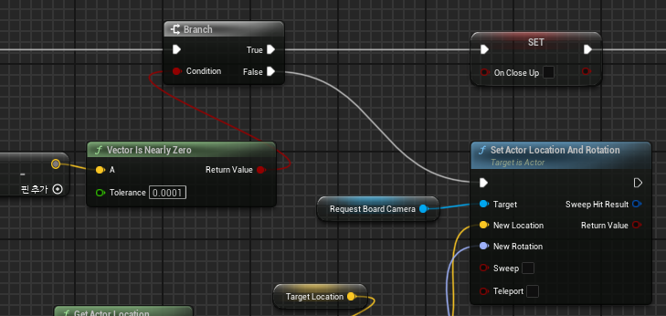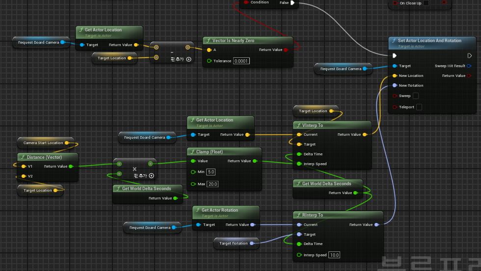 CloseUp 작업 안에서는 RequestBoardCamera의 위치를 받아 TargetLocation과의 위치를 비교해 거의 일치할 때까지 확인하게 된다.
