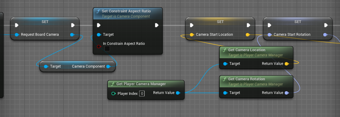 스폰한 CameraActor를 기억하기 위해 RequesBoardCamera라는 변수로 지정해주고 양옆 또는 위 아래에 검정색으로 짤려서 표시되는 것을 방지하기 위해 Set Constraint Aspect Ratio로 종횡비 설정을 해제해준다.