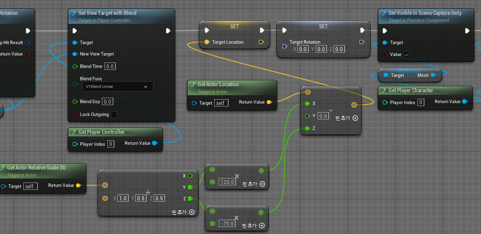 또한 실제 월드상에서 카메라를 이동시키는 것이기 때문에 그 액터를 전부 보여주기 위해서 캐릭터의 메시를 CloseUp이벤트를 수행할 때 안보이게 Set Visible Scene Capture Only로 보이지 않게 만들어준다.