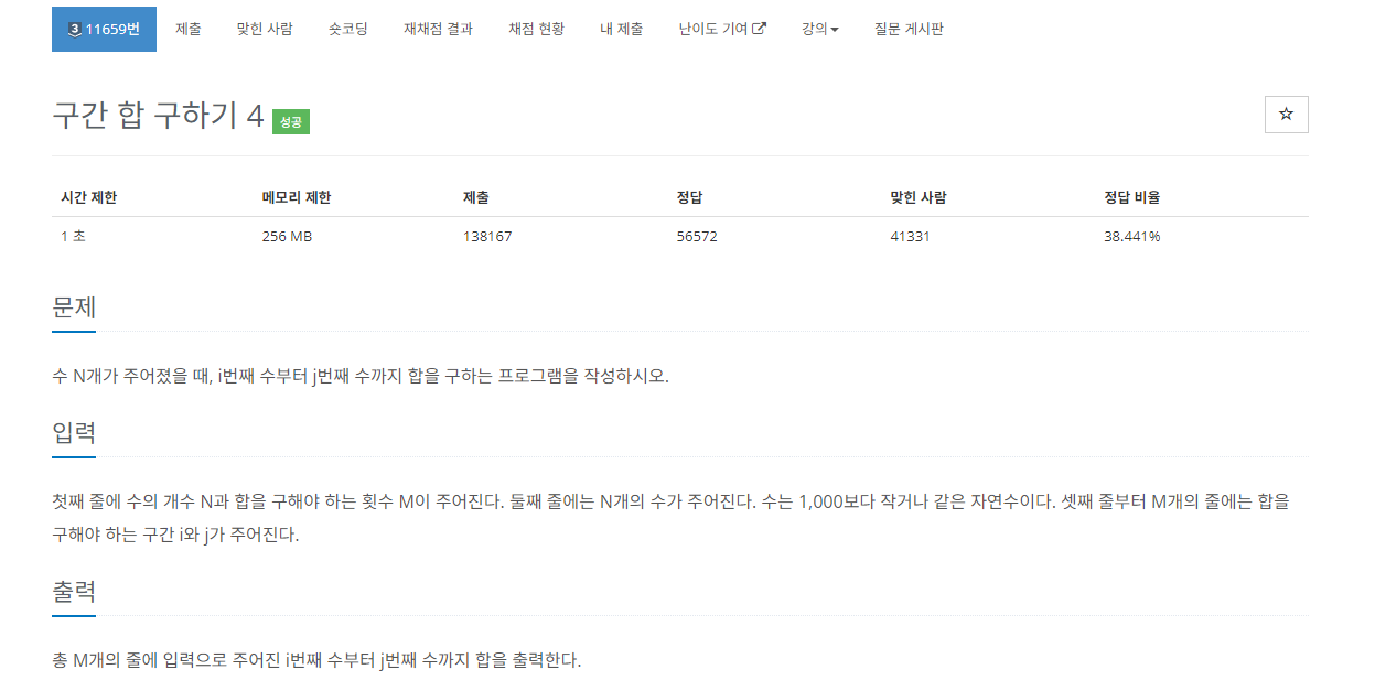 어떤 구간을 구하고 싶으면 끝나는 인덱스와 시작지점 - 1의 인덱스를 빼주면 그 구간의 합이 구해지게 된다.