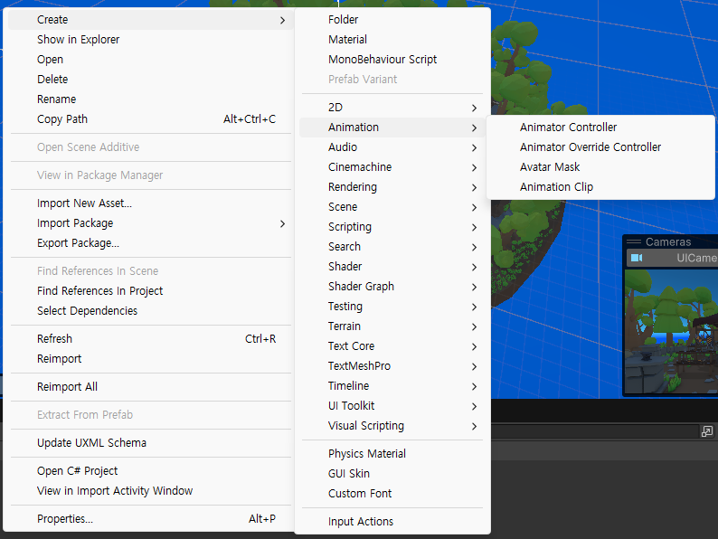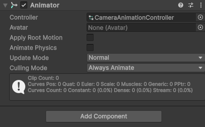 이를 구성하여 적용할 Animator Controller를 하나 만들어 이름을 CameraAnimationController로 지정하여 준다.