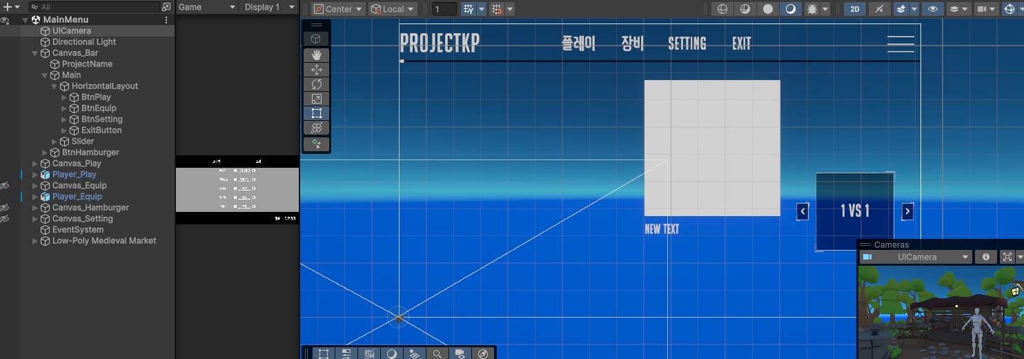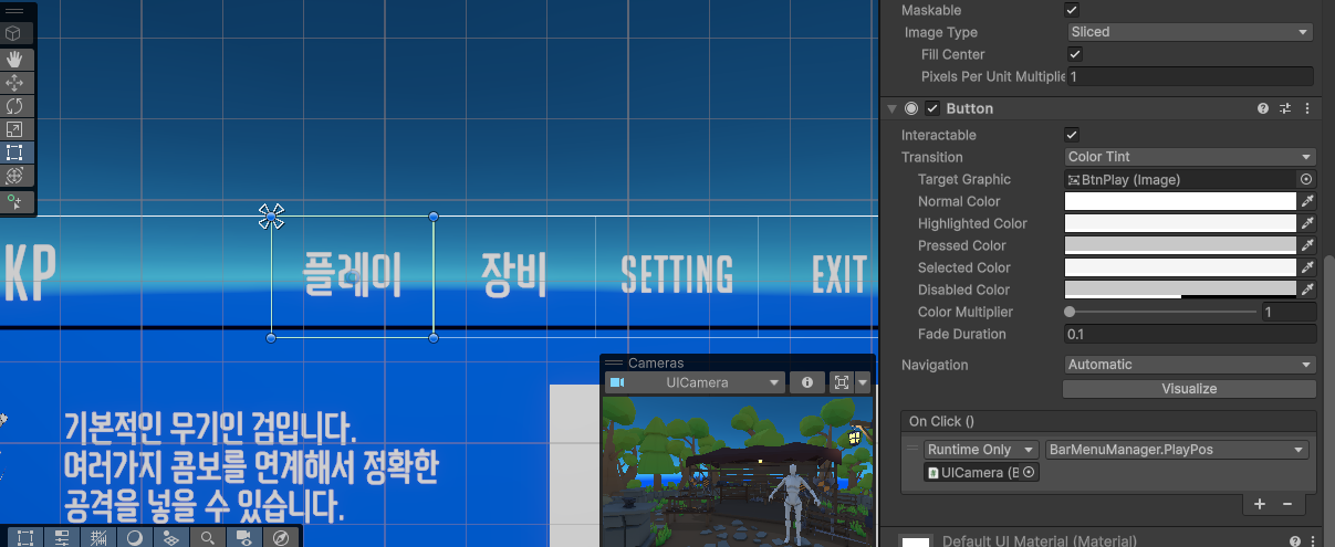 필자의 프로젝트에서는 메인 메뉴에서 움직이는 카메라는 UICamera이고 시작메뉴가 PlayPos이고, 장비 메뉴가 EquipPos로 진행하였다.